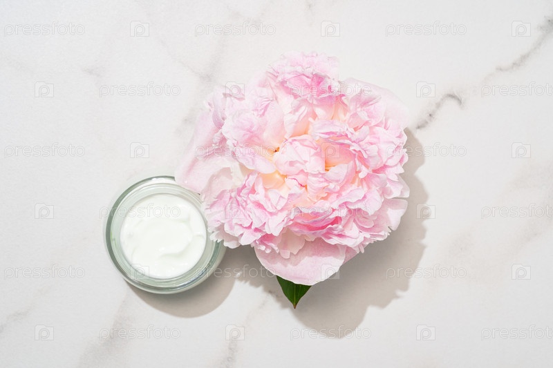 Открытая кружка с кремом, окруженная свежими лепестками пионки на мраморе, раскрывает богатую текстуру. премиальный крупный план по уходу за кожей для брендинга красоты и визуализации продукта