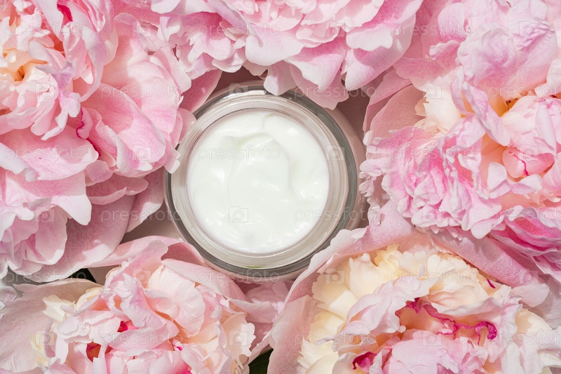 'Открытая банка по уходу за кожей с бархатным кремом, выставленная рядом с росовыми пиониками, приглашающая к прикосновению