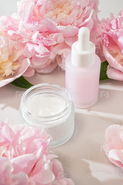 Дисплей продуктов по уходу за кожей с кремовой банкой, бутылкой сывороточной и пионным акцентом, идеально подходит для визуальных изображений электронной коммерции, каталогов магазинов красоты и контента витрины продукта