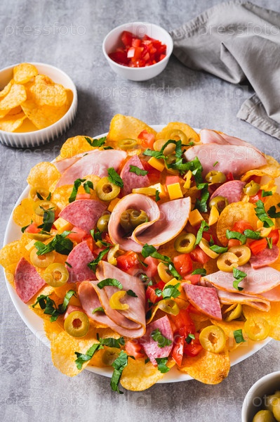 Charcuterie nachos трендная закуска с картофельными чипсами на тарелке на столе вертикальный вид
