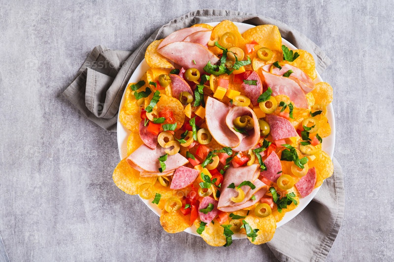 Закройте чаркутерие начо с чипсами, салями, сыром и оливками к верхнему виду тарелки