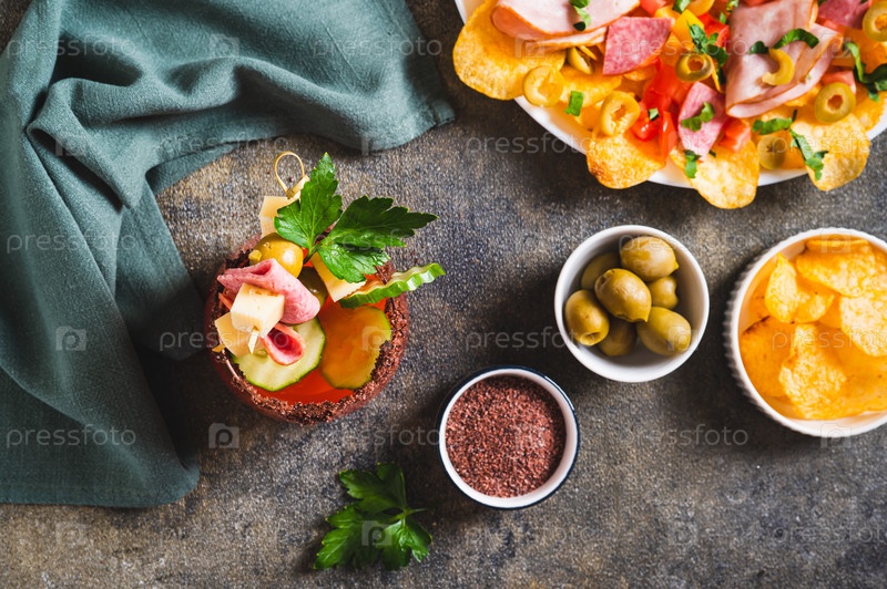 Коктейль и закуска в одной порции в стакане с видом сверху стола