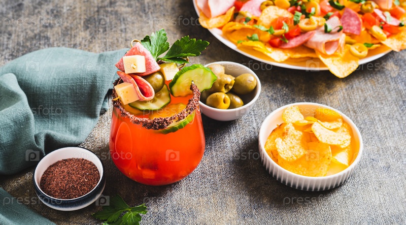 Коктейль и закуска в одной порции в стакане на столе веб-баннер