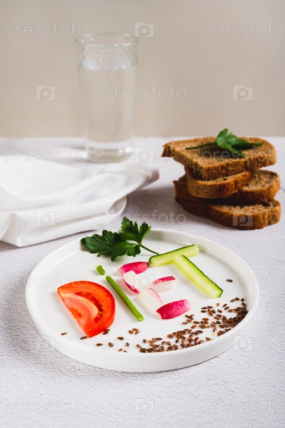 Концептуальная диета на тарелке с низкокалорийными продуктами питания на столе вертикальный вид