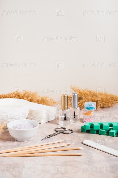 Набор предметов для маникюра и педикюр на столе вертикальный вид