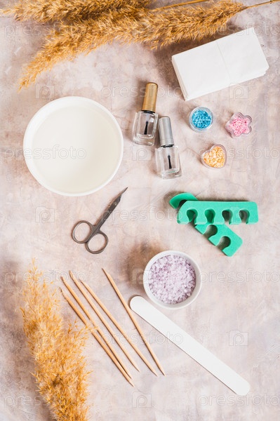 Набор предметов для маникюра и педикюр на столе верхний и вертикальный вид