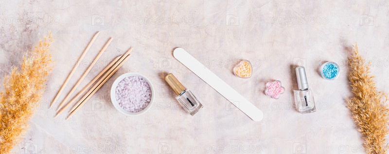 Набор предметов для маникюра и педикюр на веб-баннере с видом на стол