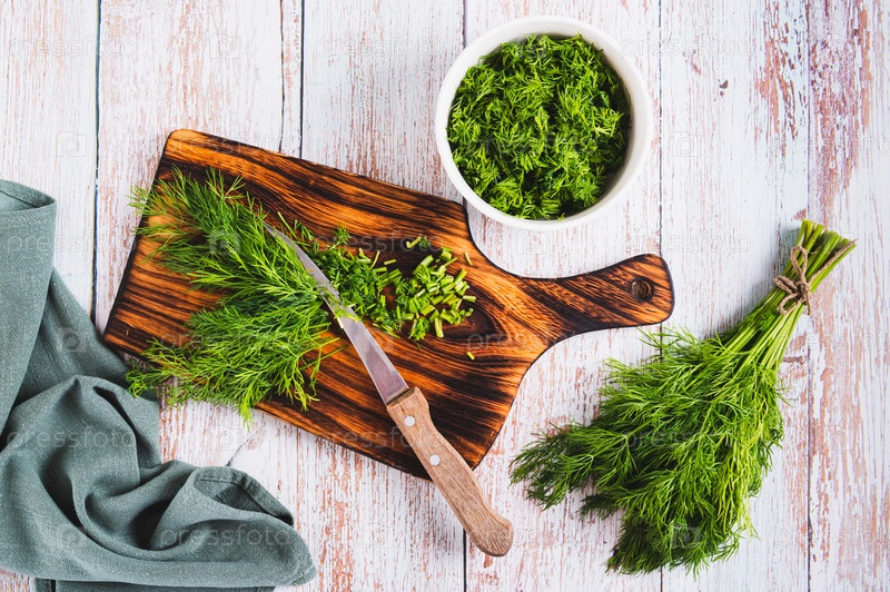 Раздробленный укроп на деревянной доске и нож сверху стола