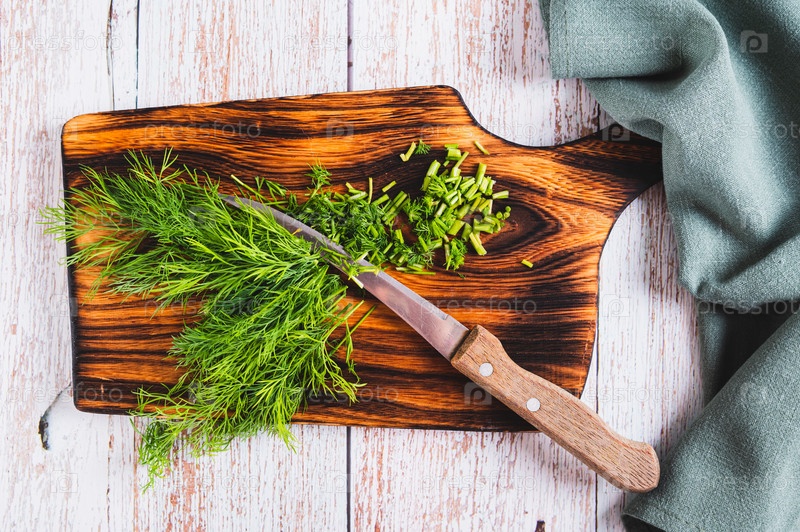 Покройте нарезанный уксус на деревянной доске, а нож - в столе с видом сверху