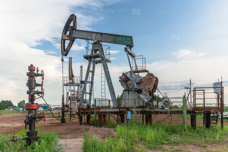 Добыча нефти на месторождении с использованием двух раскачивающихся машин. На заднем плане буровая установка и оборудование для бурения скважин. Лето. Прекрасное небо и природа