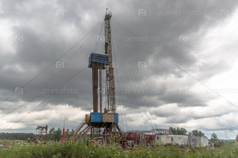 Сверление скважины на нефтяном месторождении. На переднем плане - мобильная установка. На заднем фоне, добыча нефти на поле с использованием катущейся машины. Лето. Прекрасное небо и природа