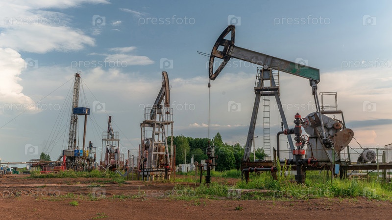 Добыча нефти на месторождении с использованием двух раскачивающихся машин. На заднем плане буровая установка и оборудование для бурения скважин. Лето. Прекрасное небо и природа