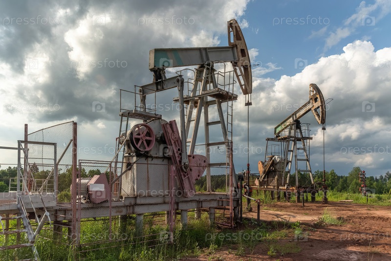 Добыча нефти на месторождении. Извлечение нефти из образования с помощью качелистых машин. Строительство колеблющейся машины. Лето. Красивое небо и природа