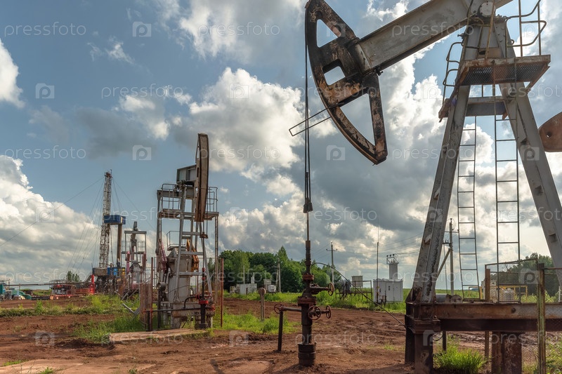 Добыча нефти на месторождении с использованием двух раскачивающихся машин. На заднем плане буровая установка и оборудование для бурения скважин. Лето. Прекрасное небо и природа