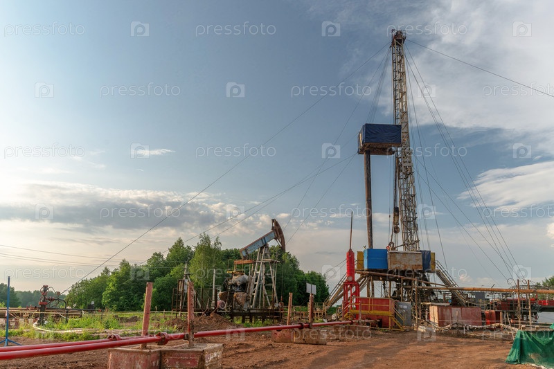 Сверление скважины на нефтяном месторождении. На переднем плане - мобильная установка. На заднем фоне, добыча нефти на поле с использованием катущейся машины. Лето. Прекрасное небо и природа