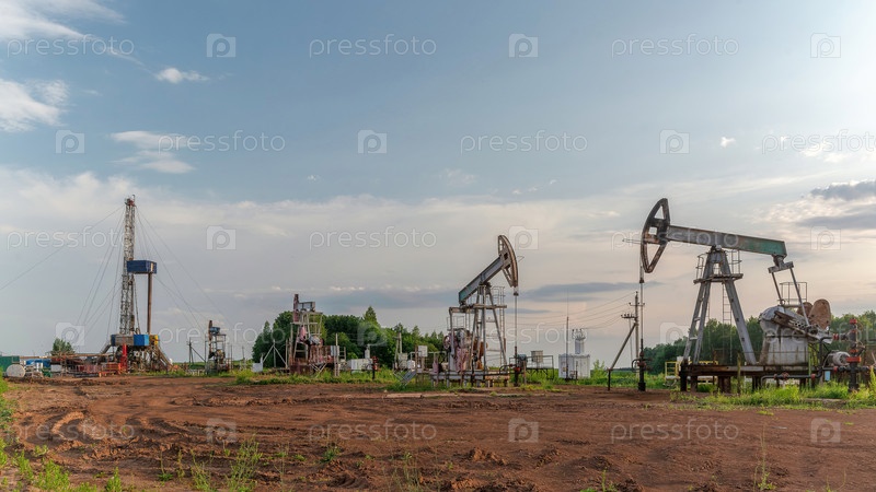 Добыча нефти на месторождении с использованием двух раскачивающихся машин. На заднем плане буровая установка и оборудование для бурения скважин. Лето. Прекрасное небо и природа