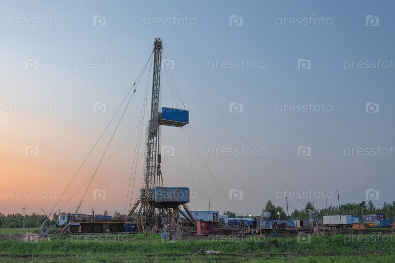 Сверление скважины на нефтяном месторождении. Мобильная буровая установка и оборудование для бурения. Лето. Красивое небо и природа