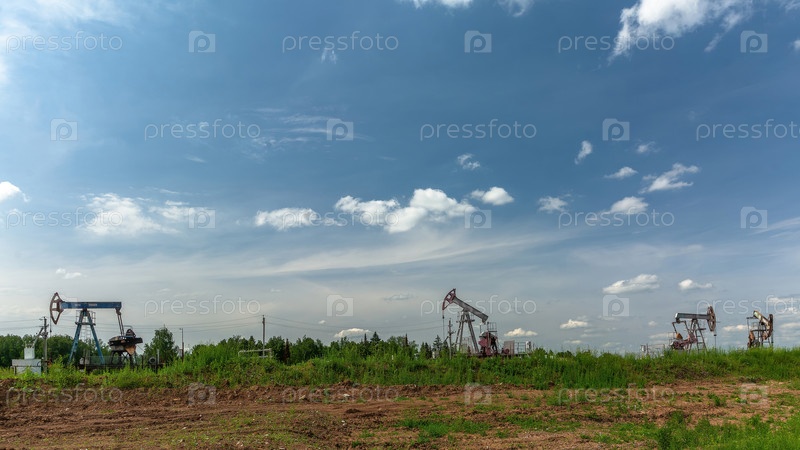 Добыча нефти на месторождении. Извлечение нефти из образования с помощью качелистых машин. Строительство колеблющейся машины. Лето. Красивое небо и природа