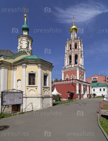 Церковь Ворота Заступничества Пресвятой Богородицы с колокольницей и церковью Толгинской Иконы Божией Матери в Высо-Петровском монастыре.Москва, улица Петровка.Солнечный день в июне