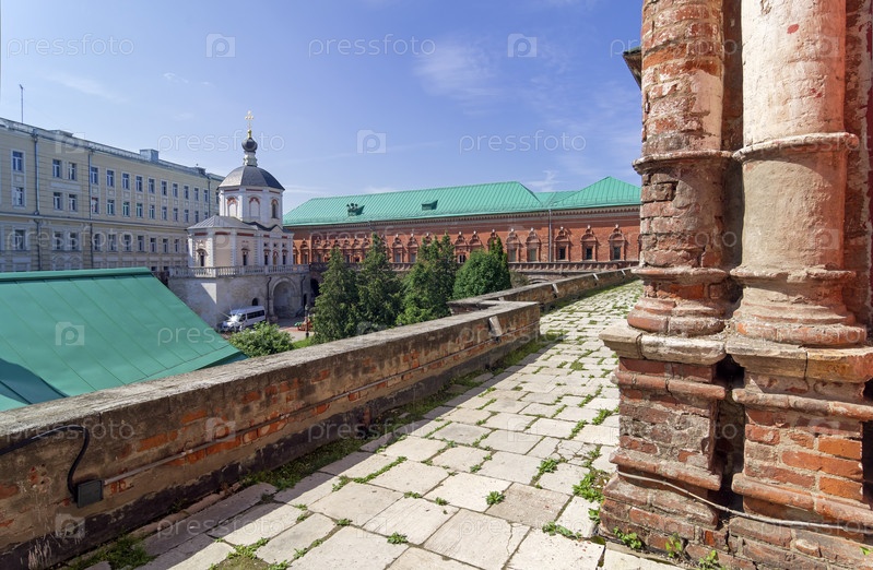 Камеры Нарышкина и церковь апостолов Петра и Павла в Высокопетровском монастыре. Москва, улица Петровка. Солнечный день в июне