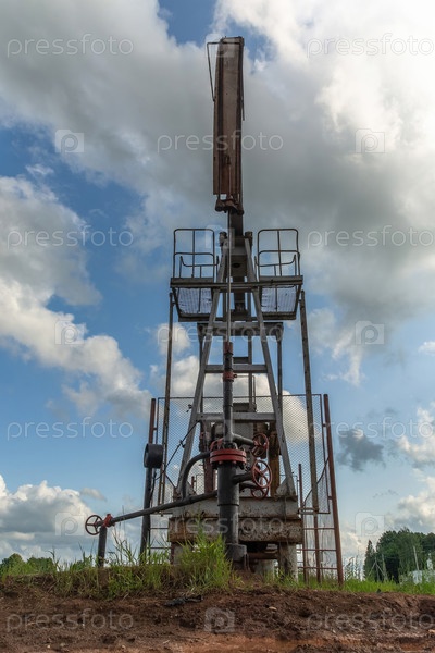 Добыча нефти на месторождении. Извлечение нефти из образования с помощью катушки. Строительство катушки. Лето. Красивое небо и природа