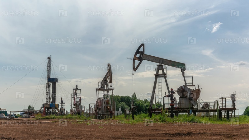 Добыча нефти на месторождении с использованием двух раскачивающихся машин. На заднем плане буровая установка и оборудование для бурения скважин. Лето. Прекрасное небо и природа