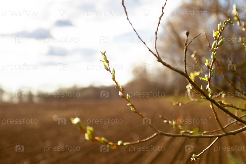Нежные ветви весенних лоз с опухшими почками на фоне размытой природы