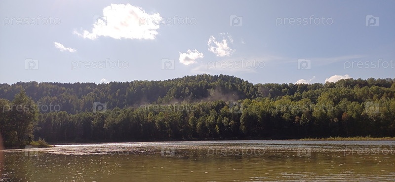 Живописный вид на спокойное озеро, окруженное пышными зелеными лесами под чистым голубым небом