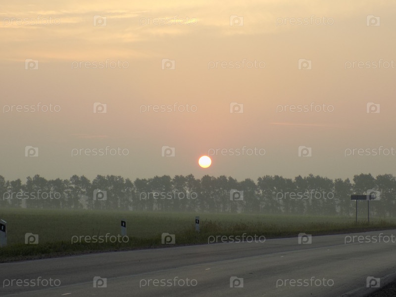 Восход солнца над тихой автомагистралью с деревьями на заднем плане, захватывая красоту раннего утреннего света и спокойствие