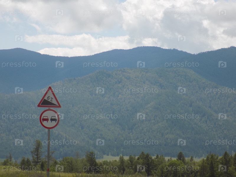 Алтайские горы - дорожные знаки, указывающие на снижение ограничений скорости для водителей вблизи горной местности и пышного зеленого ландшафта в пасмурный день