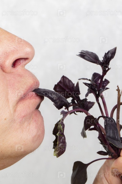Женщина, лицо которой не видно, держит в рот ветку базилика