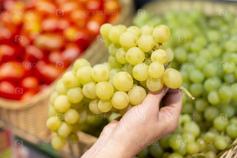Руки держат кучу зеленого винограда посреди размытого прилавка магазина