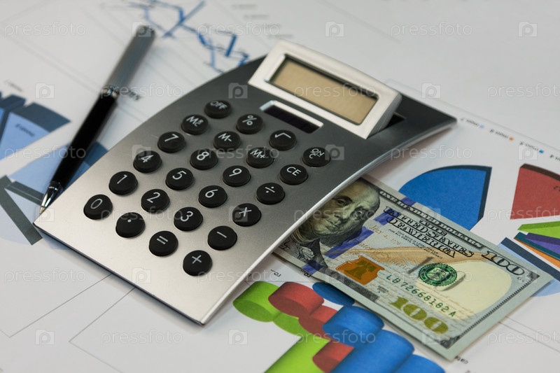 Калькулятор, сто долларов и ручка, лежащая на графиках