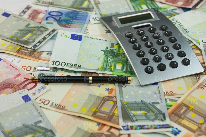 Калькулятор и деньги лежат против евро.Бизнес-идеи и концепции