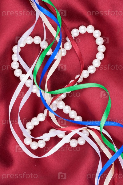 Сердца из белых бусин и красочных лент лежат на красном шелке