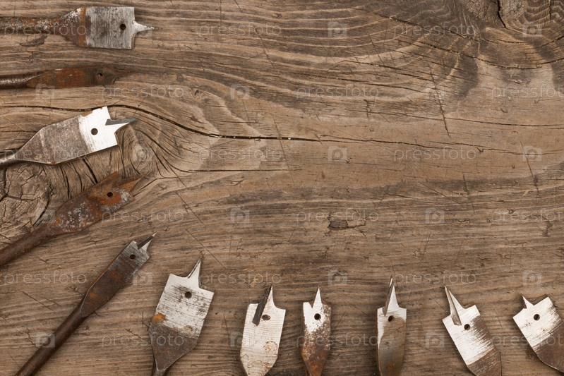 Старые металлические лопатки для бурения древесины лежат на деревянном фоне