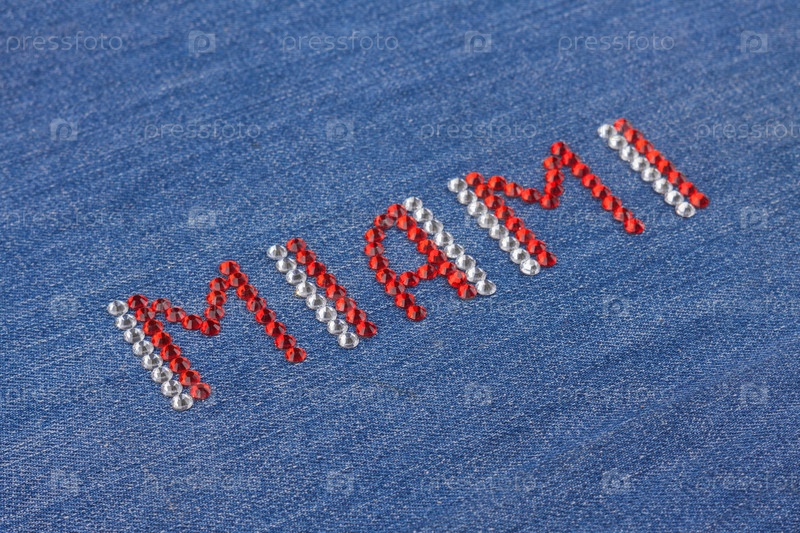 Близкая надпись Майами, инкрустированные сфинксы на джинсе