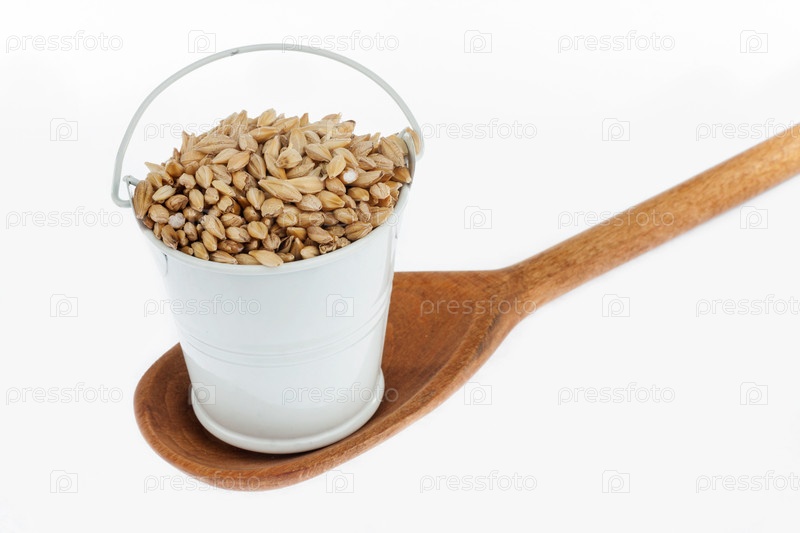 Полное ведро зерна ячменя стоит в деревянной ложке