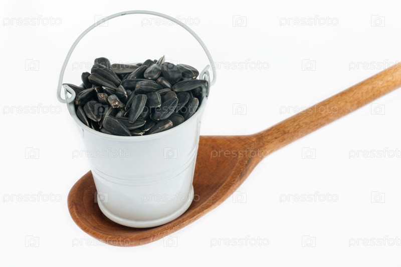 Полное ведро с семенами подсолнечника стоит в деревянной ложке