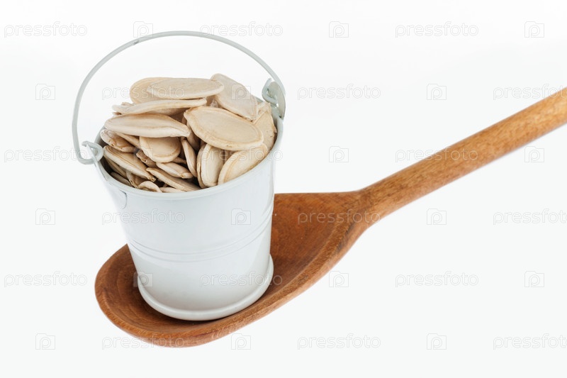 Полное ведро тыквенных семян стоит в деревянной ложке