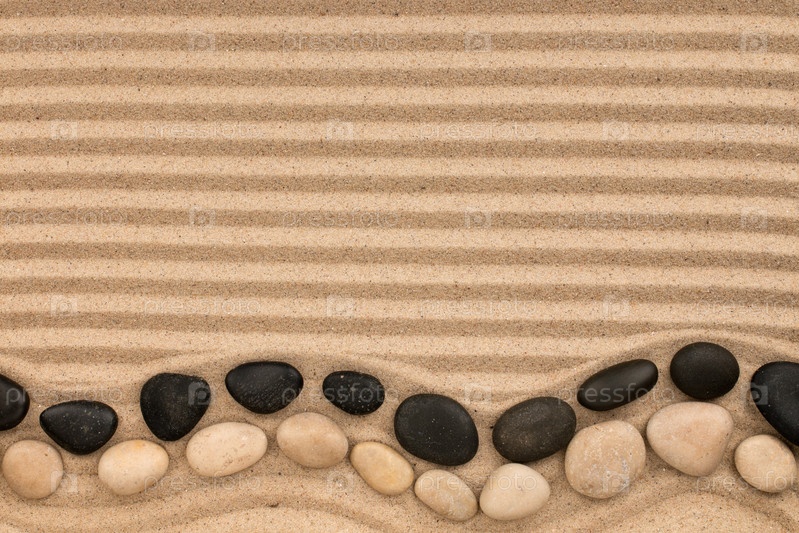 Два ряда камней, черно-белых, лежат на полосатом песке с пространством для текста