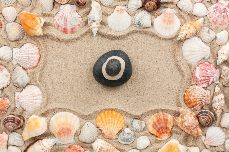 Скалистая пещера в песке среди морских раковин