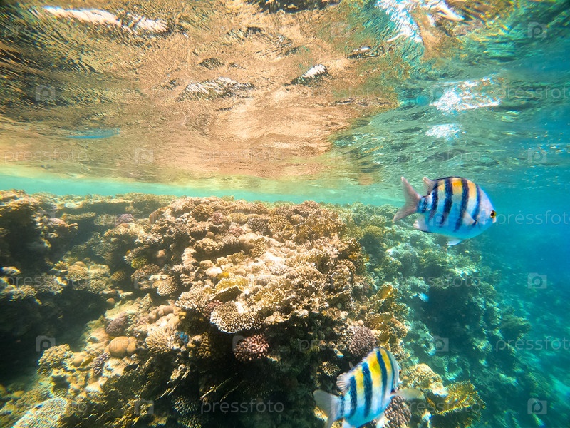 Тропический сержант большой рыбы плавает возле кораллового рифа в Красном море, Египет