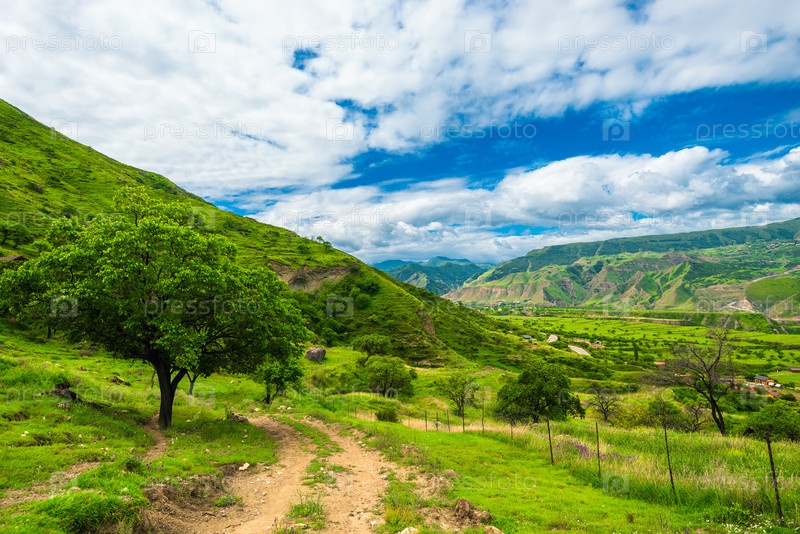 Красивый пейзаж с одиноким деревом и грунтовой дорогой.Дагестан