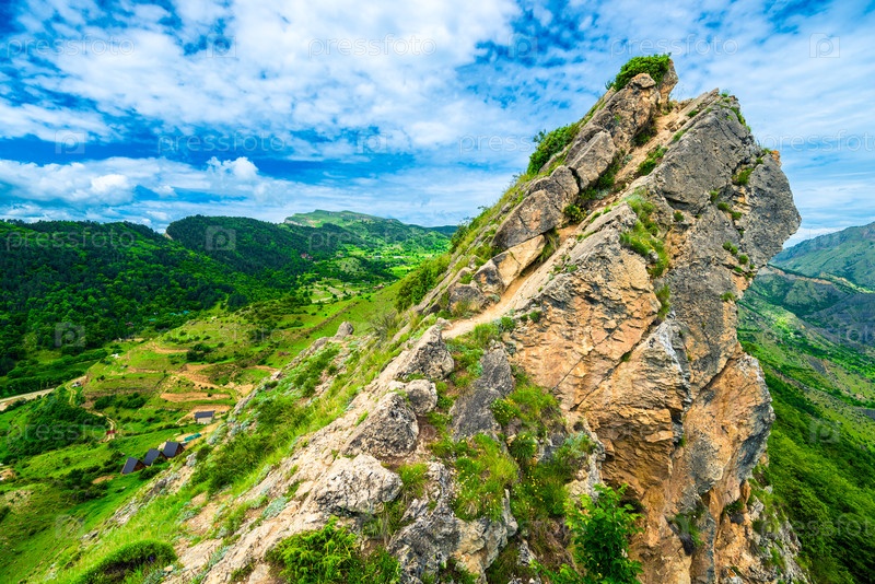 Прекрасный вид на скалистую вершину над зелеными горами.Дагестан, Кавказ