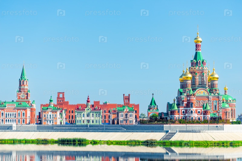 Живописный собор Благовещения Пресвятой Девы Марии в Йошкар-Оле на берегу реки.Россия