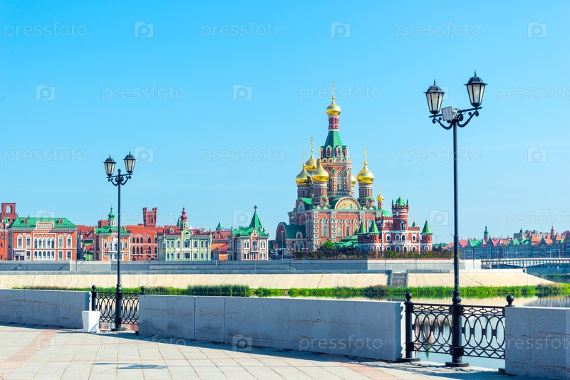 Живописный собор Благовещения Пресвятой Девы Марии в Йошкар-Оле на берегу реки.Россия