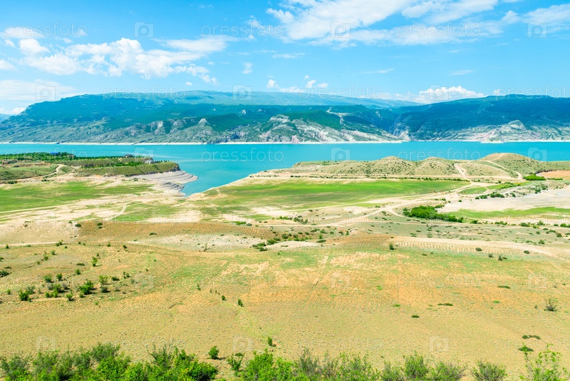 Красивый пейзаж горного водохранилища Чиркей с лазурьевой водой Северного Кавказа Дагестана.Россия