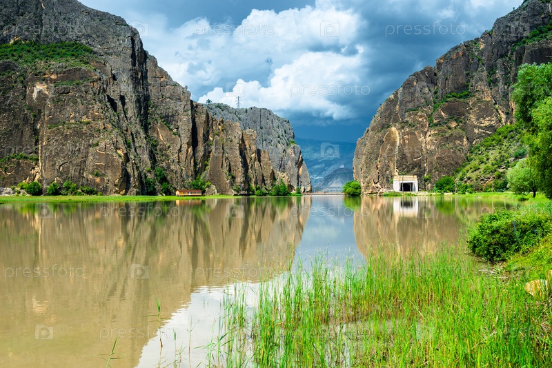 Драматический пейзаж живописного ущелья на горной реке в пред штормовую погоду на Дагестанском высокогорье Северный Кавказ Россия