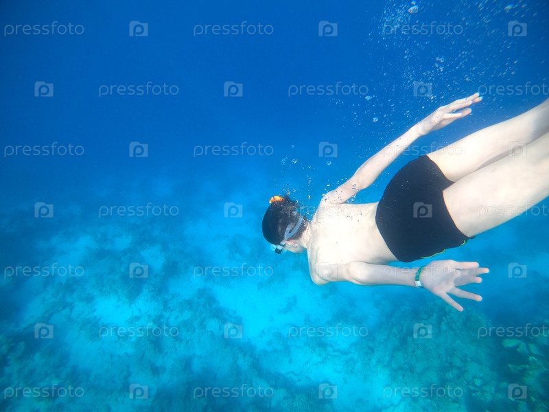 Мальчик, занимающийся подводным плаванием, погружается глубоко в голубое море возле кораллового рифа
